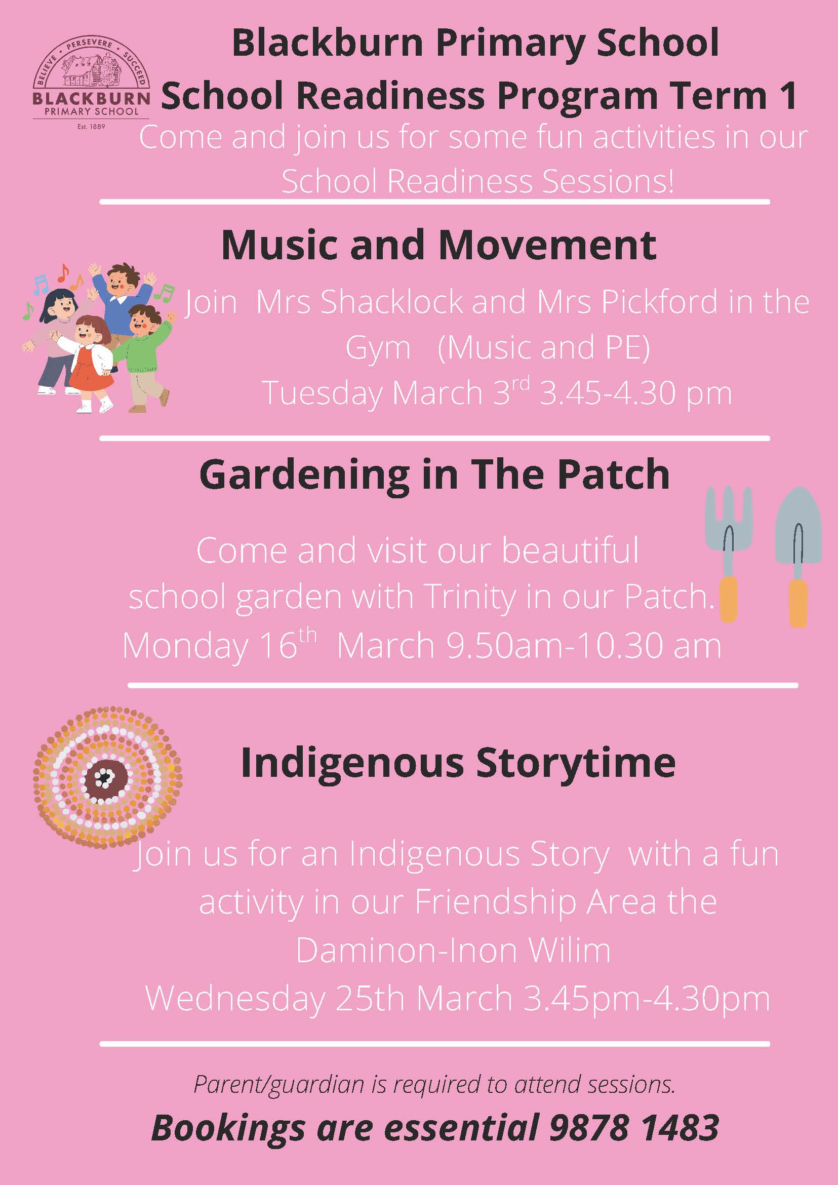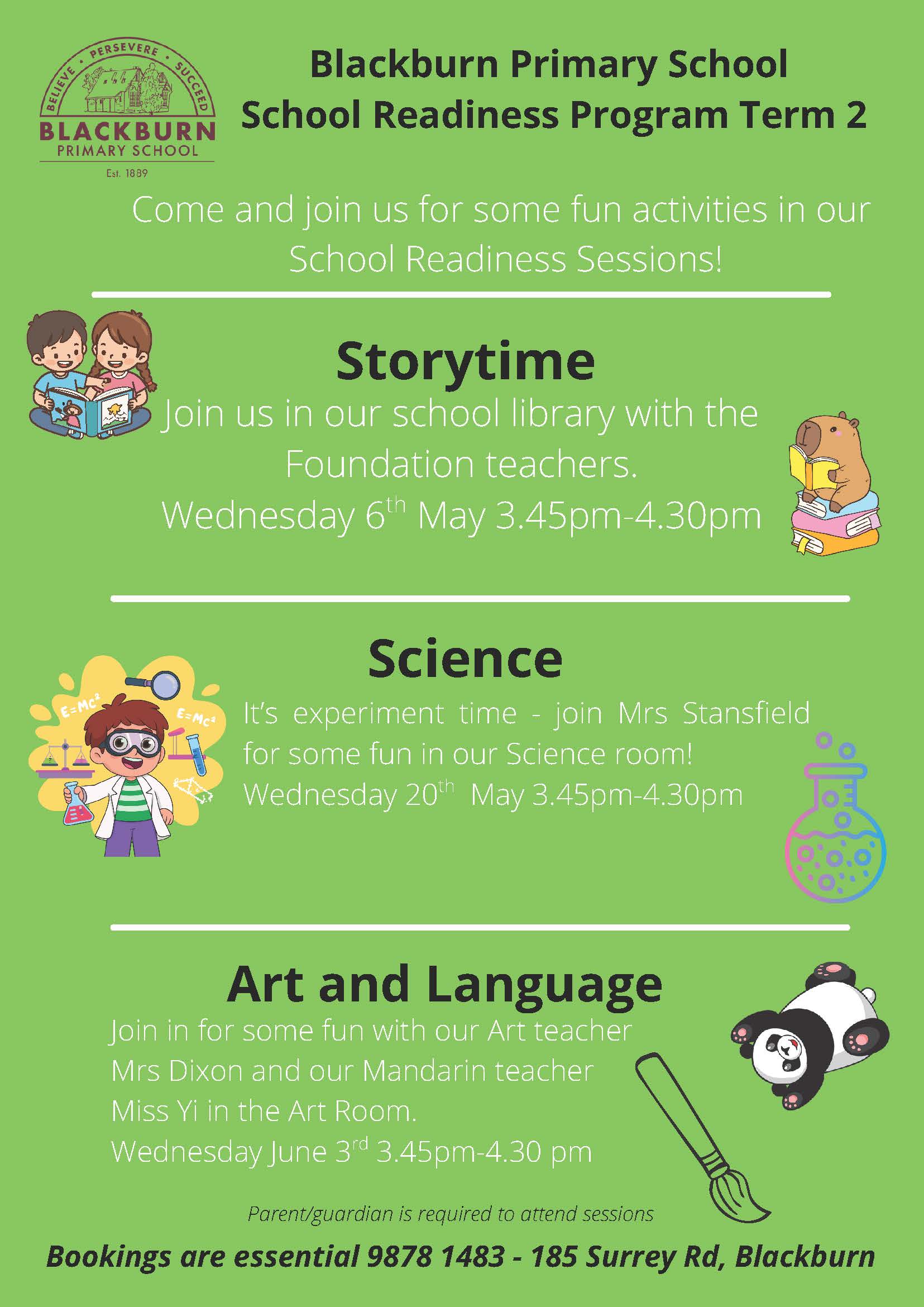 Throughout Term 1 to Term 3 we offer a range of school readiness sessions. Each term we run Storytime, Music & Movement and Art & Language sessions with our current Foundation and specialist teachers. These sessions are a chance for your child to begin getting comfortable in a school environment and start making some connections at BPS. It is also a fantastic chance to engage with current Foundation teachers and ask questions about what Foundation looks like in 2027 and how to best support and prepare your child.